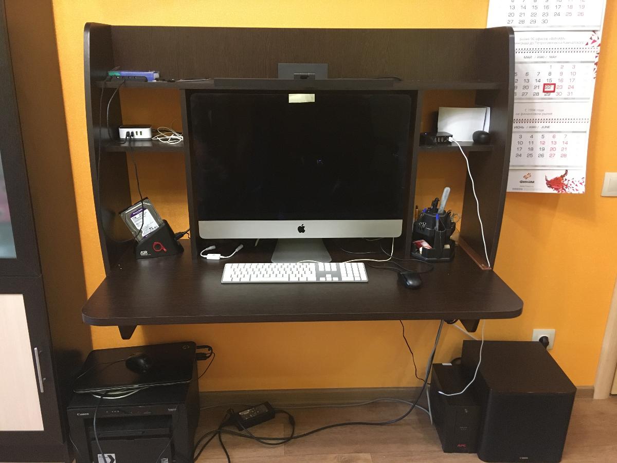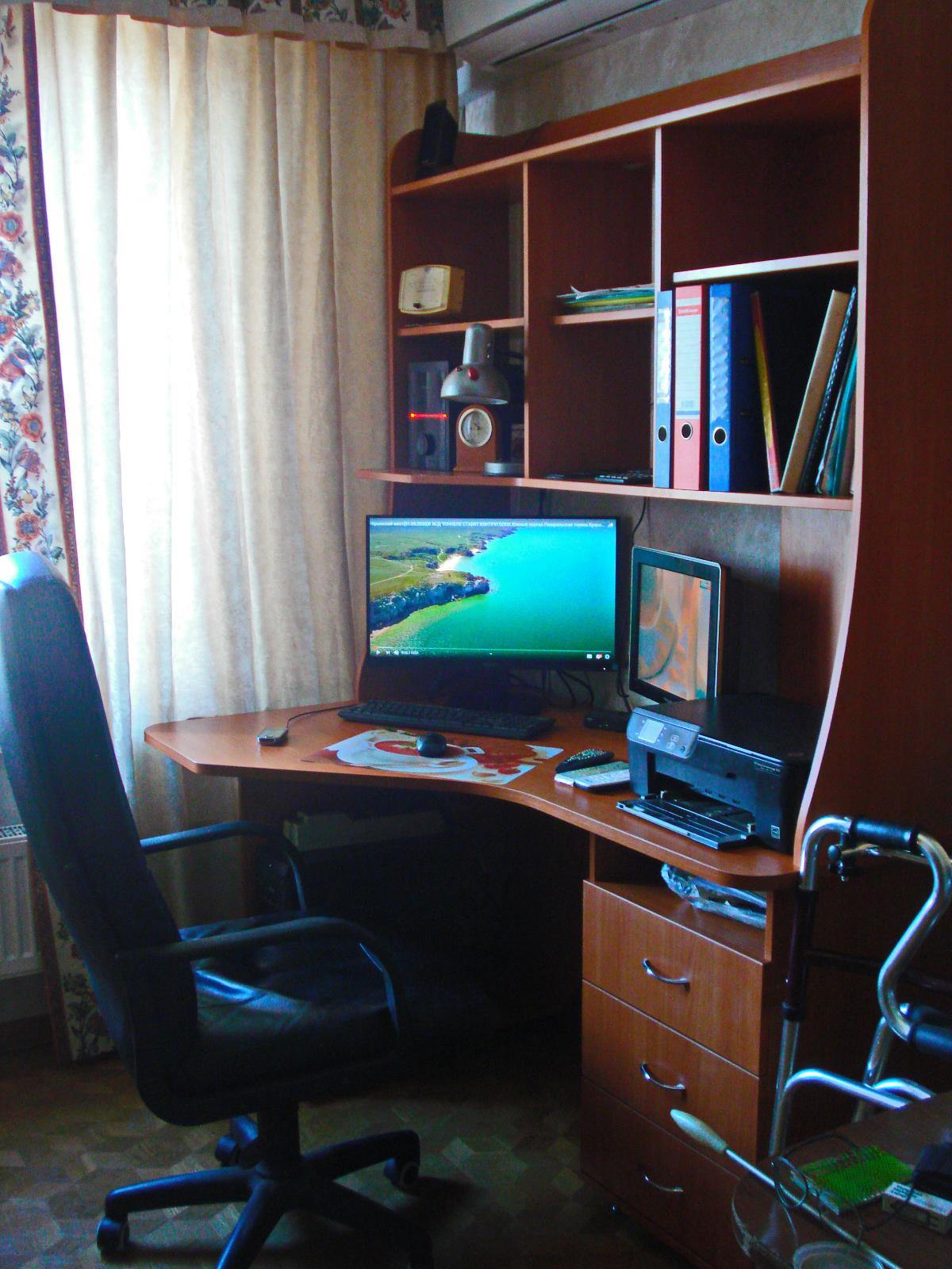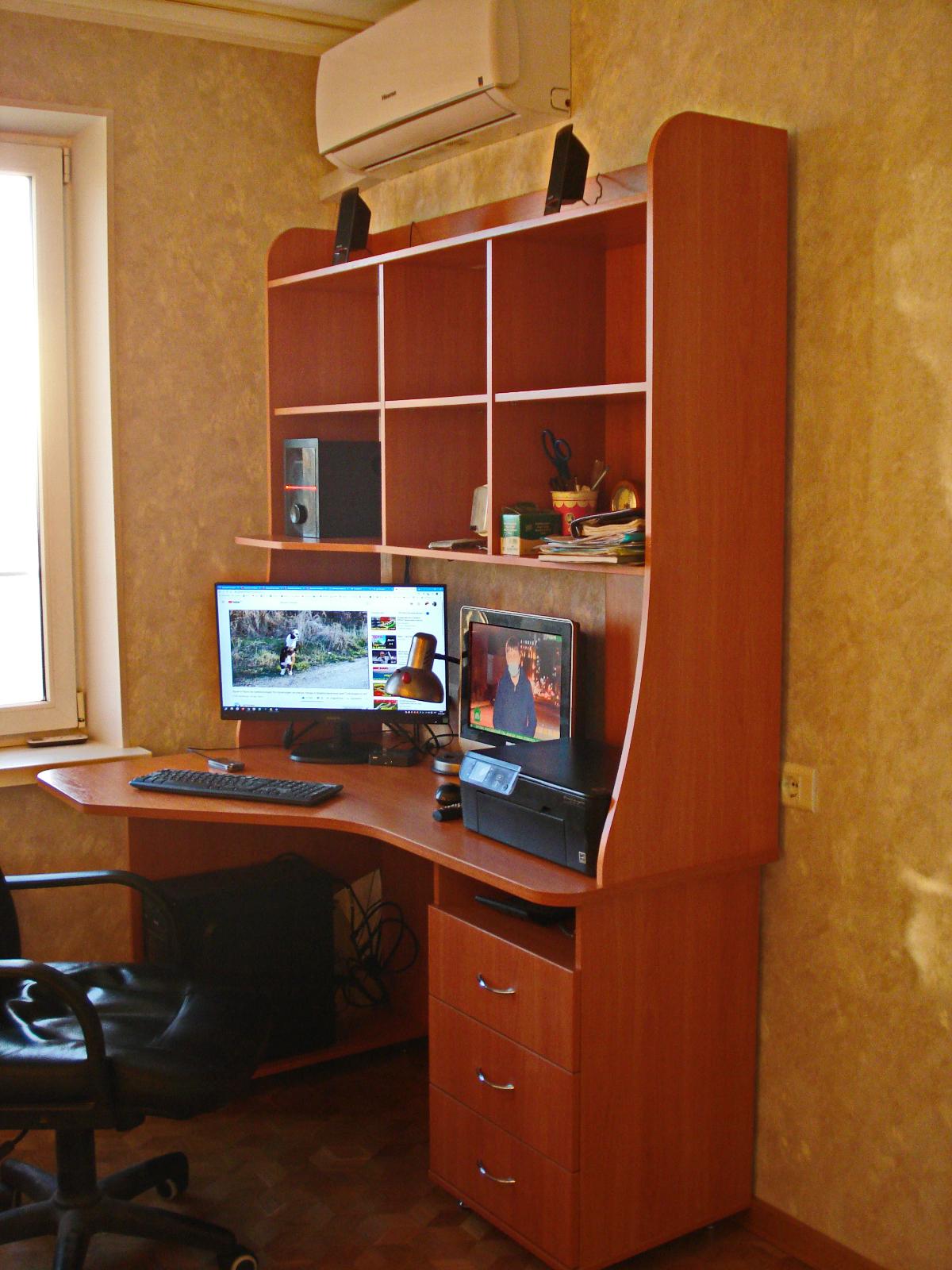 Стол для ПК выбирал долго. Понравилась вариабельность данного заказа по размерам и цвету, удобство, эргономика. Отличный доступ к системному блоку ПК. На столе отлично разместились монитор 24" , ТВ 15", Принтер-сканер-копир НР. Отказался в заказе от выдвижной полки для клавиатуры, стеклянной дверцы на полке и полки для компакт-дисков ( к сожалению на цену заказа это не повлияло...) Собрали самостоятельно, вдвоём за 8 часов. На полках отлично разместились звуковые колонки и усилитель ПК, папки и разные мелочи. Изготовили и привезли удивительно быстро (за неделю)Недостатки: 1. Оплата только наличными; 2. В столешнице в углу желательно делать стандартное отверстие с крышкой для пропуска соединительных проводов ПК, монитора, принтера; 3. Ножки стола на 10-15 мм больше или варианты высоты в заказе ( При высоких плинтусах стол не плотно примыкает к стене) 4. Торцовочная лента столешницы  во "впуклости" из за температурных напряжений через 2 недели начала отклеиваться...Пришлось подклеивать и фиксировать саморезом с пресс-шайбой. На функциональные возможности это не повлияло, но осадочек остался.