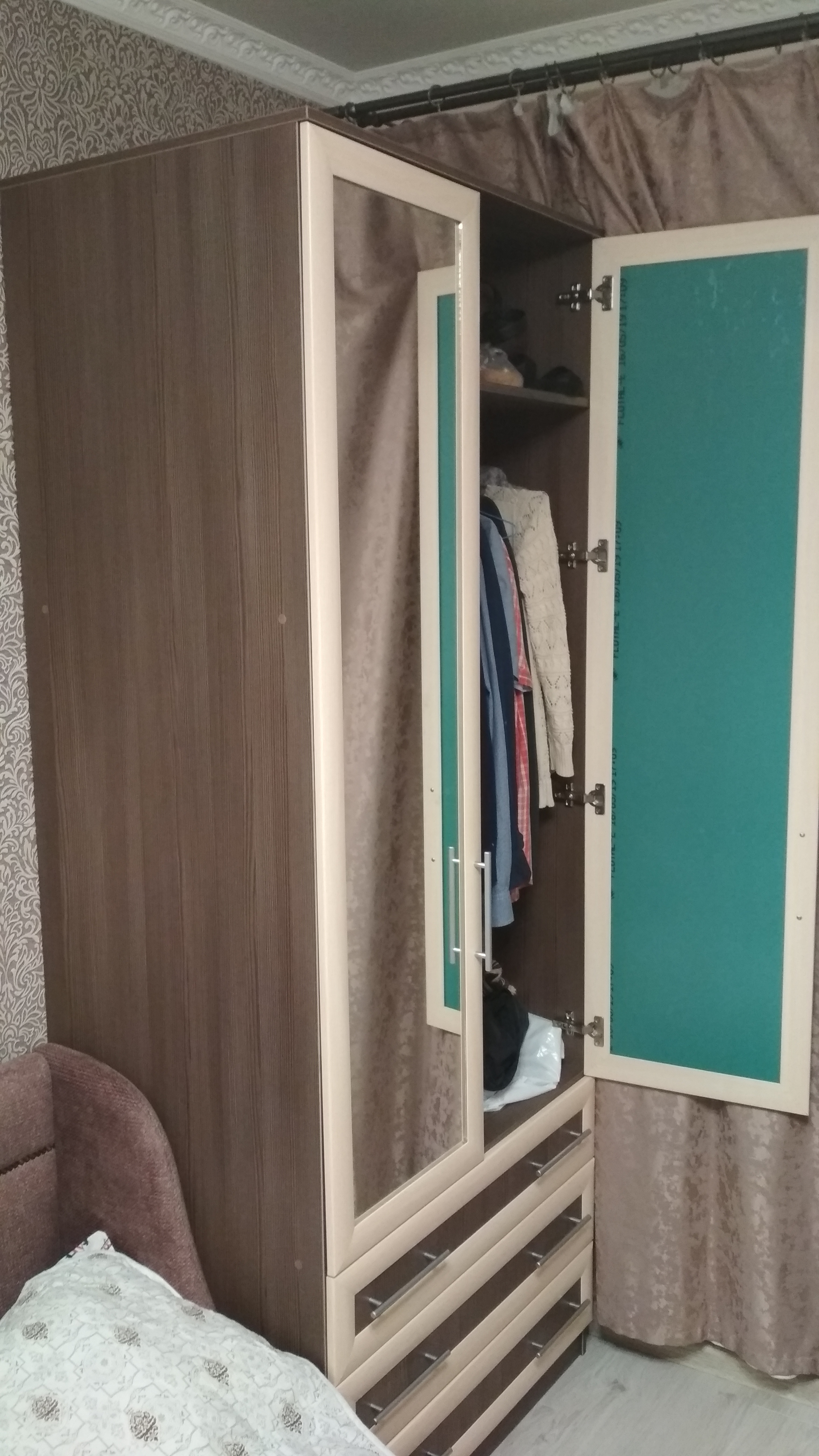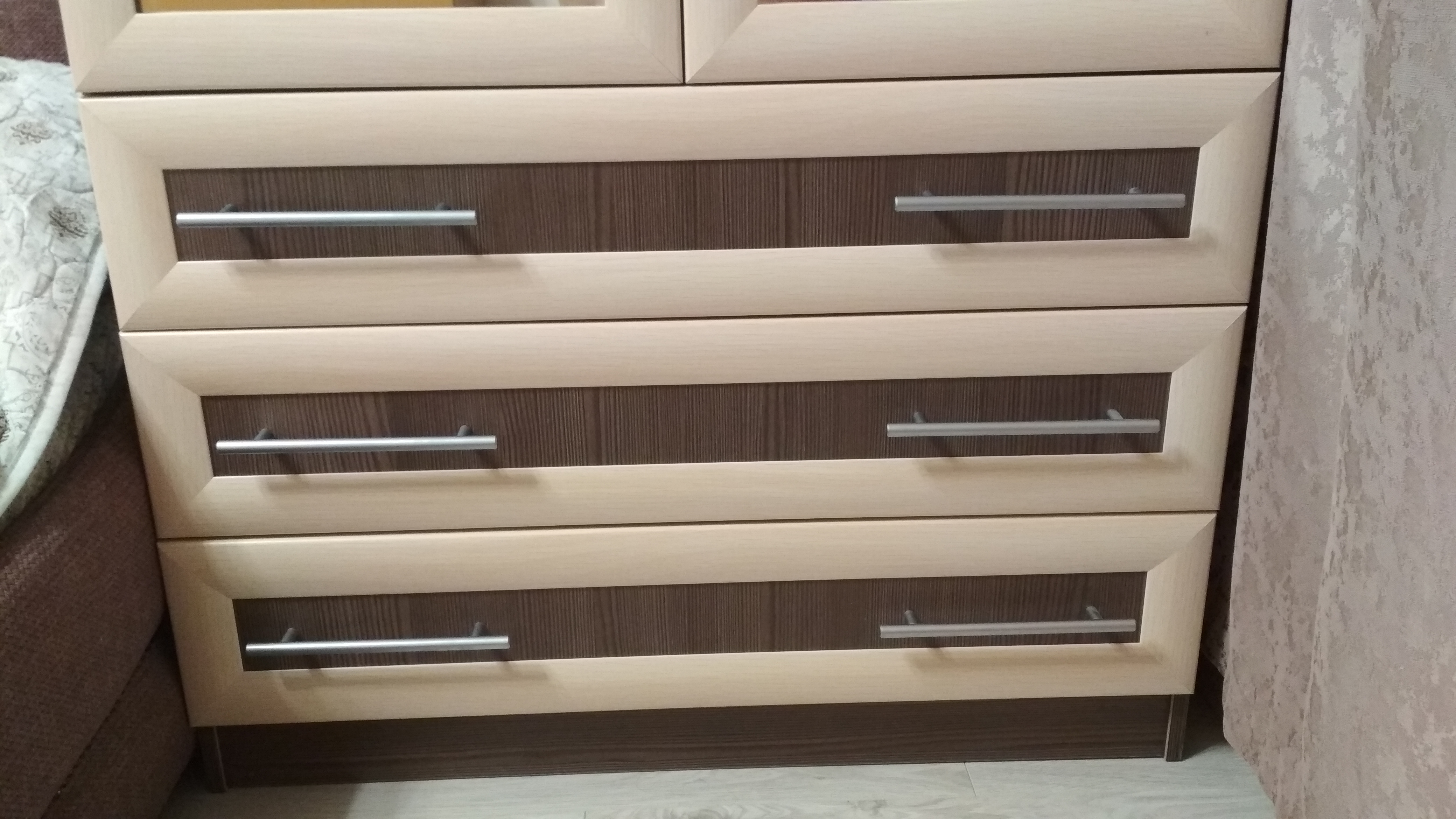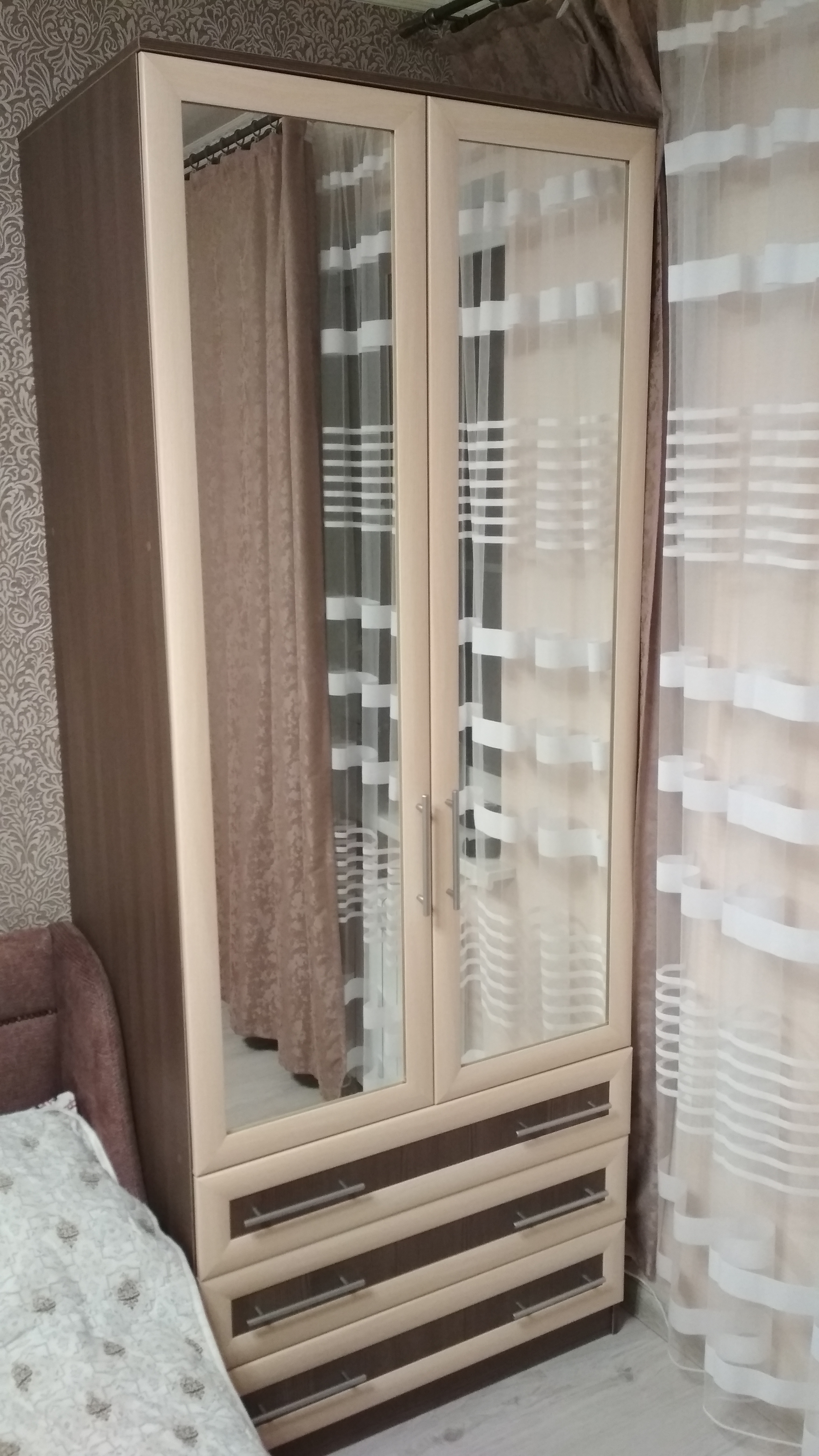 Заказали шкаф в спальню. На сайте выбрали модель. Материал, цвет полностью изменили. Добавили ящик. Внутреннее наполнение можно сделать на свой вкус. Также двери шкафа сделали с зеркалами. Шкаф очень нравится, получился красивый, большой, функциональный, материал гладко обработан, нет никаких изъянов. Петли с доводчиком хорошо исправно работают не скрипят, нижние ящики легко выдвигаются, все механизмы исправны. Шкафом очень довольны.